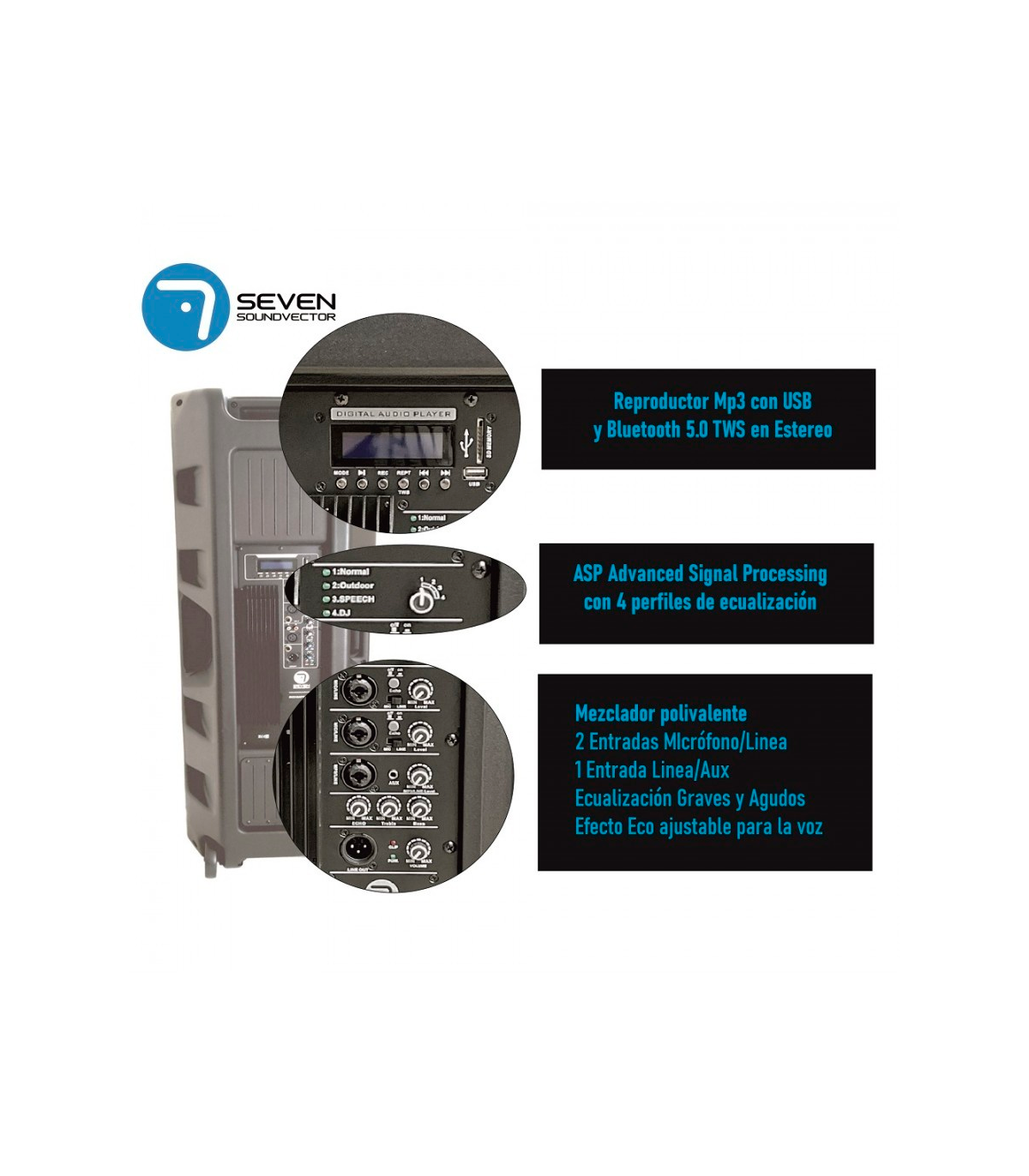 . Procesamiento ASP con 4 perfiles de ecualización Normal/Exterior/Voz/DJ
