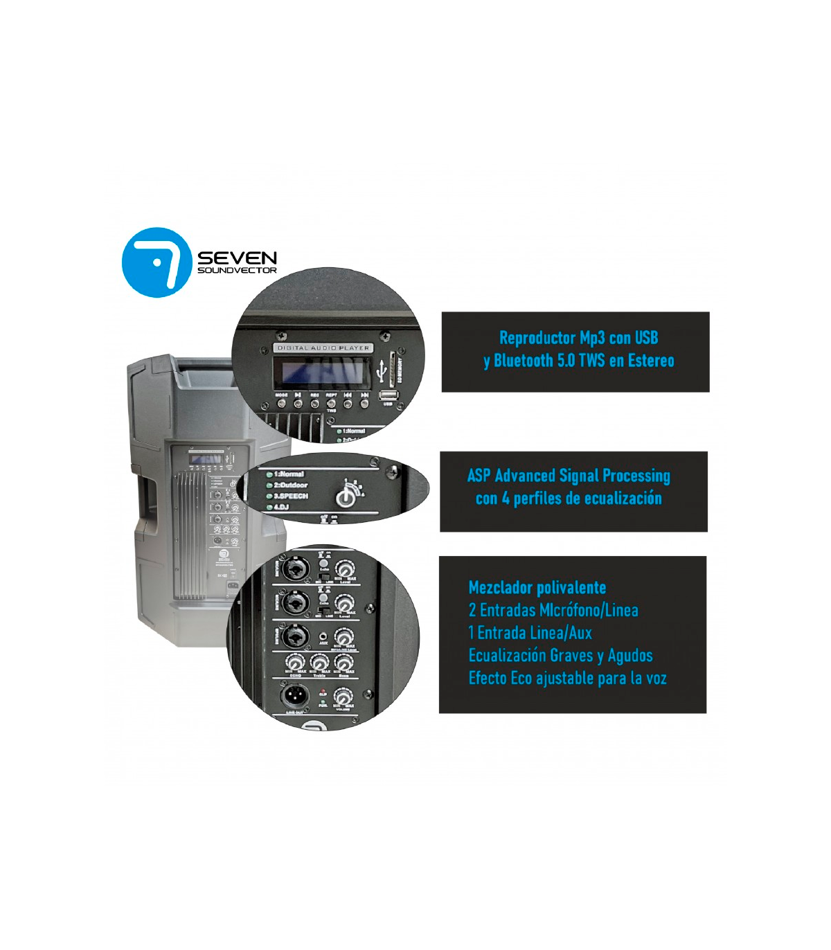 SEVEN SOUND VECTOR SV12APRO-TWS-ASP Altavoz profesional Auto amplificado de 12" MP3, BLUETOOH, TWS, ASP,, USB, SD.