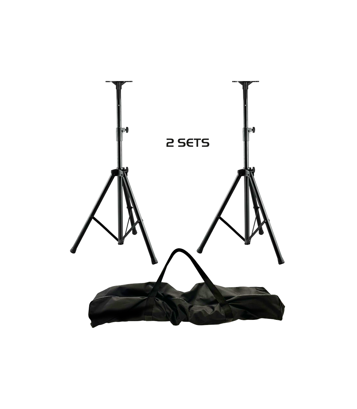 Fabricado en metal con capacidad de elevación de 1,1 m a 1,8 m. Cada soporte soporta un peso aproximado de 60 kg y está recubierto de pintura en polvo negra. Además de los dos soportes, se incluye una bolsa para facilitar su transporte y dos bases para fijar altavoces sin la clásica copa de 35 mm.