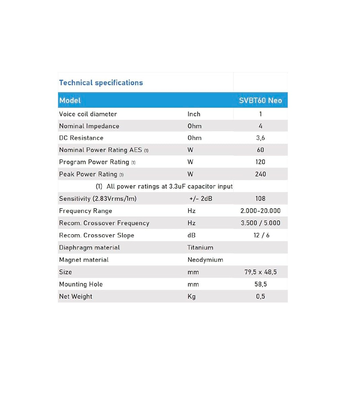 Seven Soundvector SVBT60 Neo Super Tweeter de compresión de Neodimio 108dB SPL 120W Programa 240W Peak Impedancia 4 Ohm con Divisor de frecuencia.