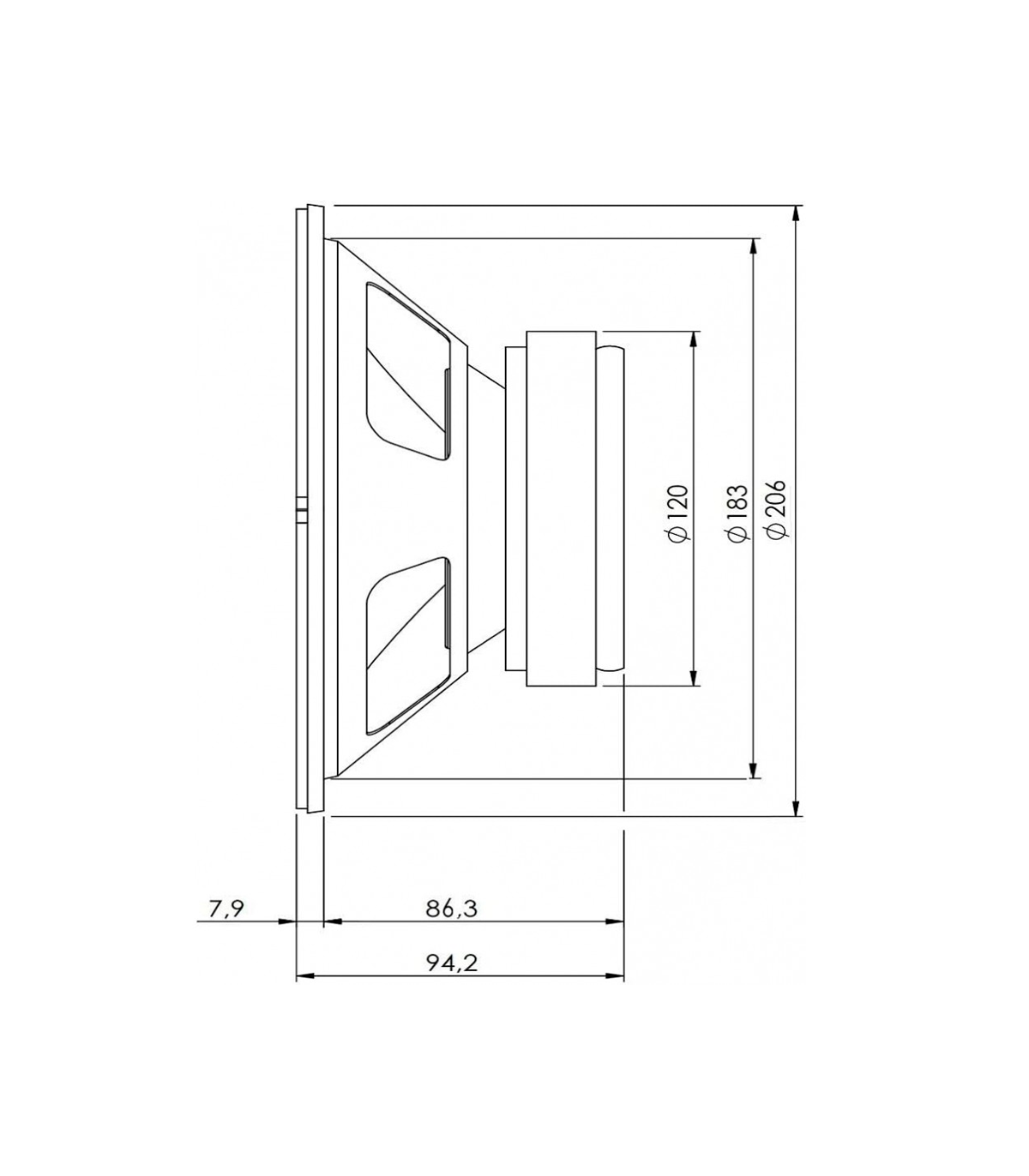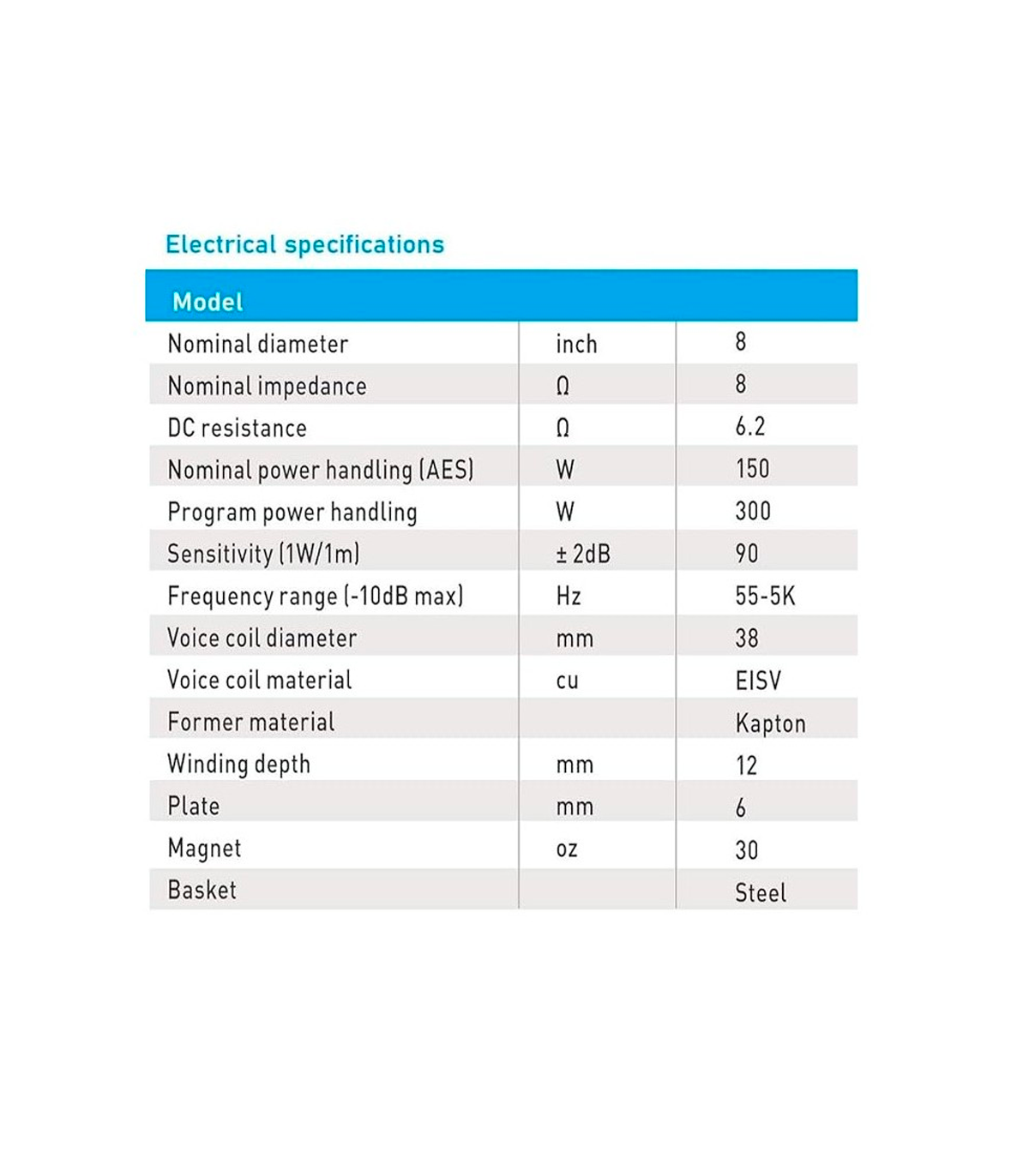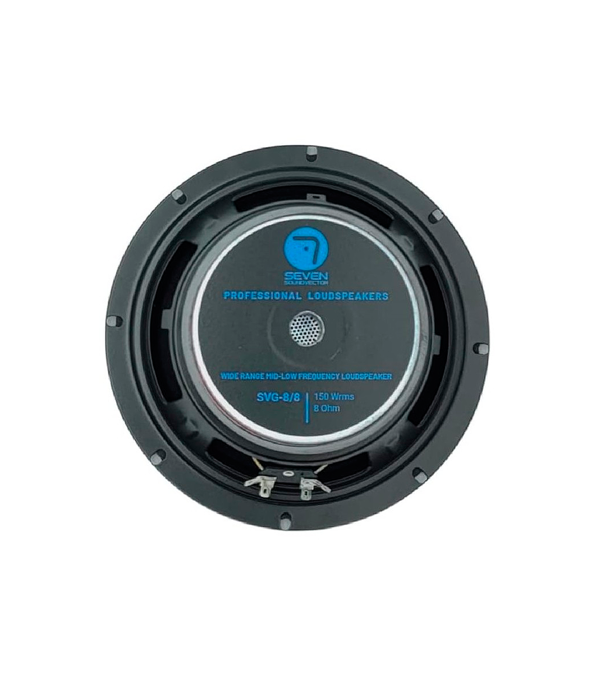SEVEN SOUNDVECTOR SVG-8 Woofer de 8" a 8 ohm, Diámetro Nominal: 8" Impedancia Nominal: 8 Ohmios, Manejo de Potencia Nominal (AES): 150W Rango de Frecuencia (-10dB Max): 55Hz - 5Khz.