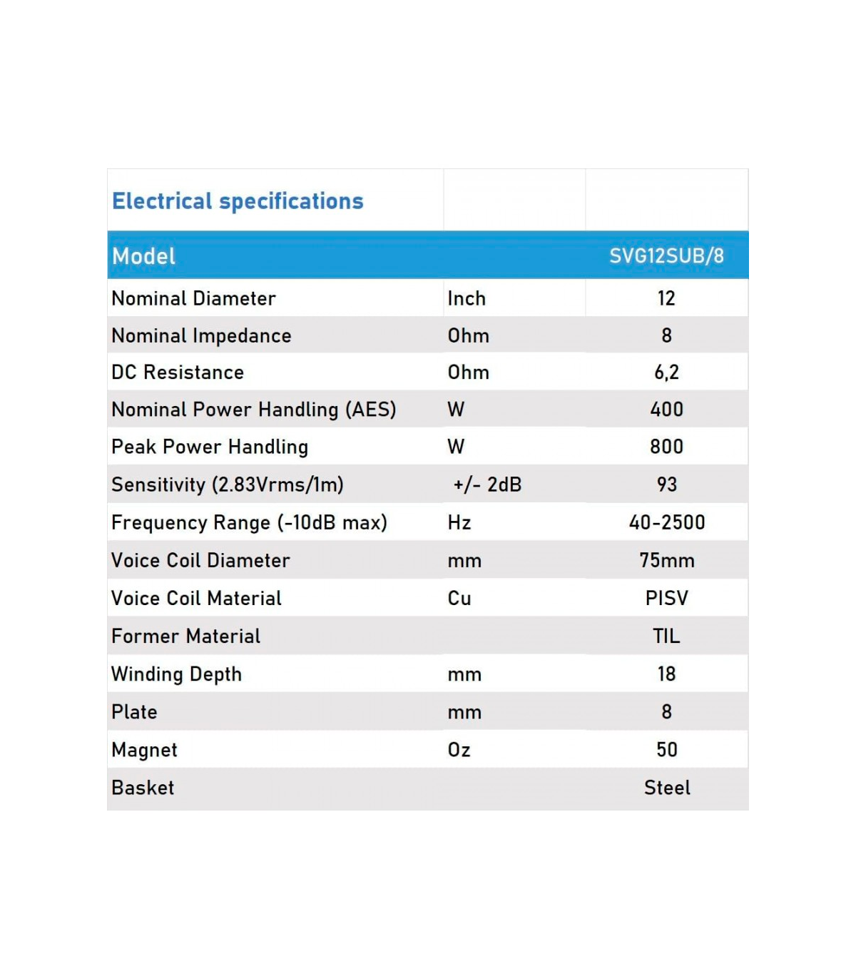 SVG12SUB/8 SUBWOOFER 12" 8 Ohm 400W AES